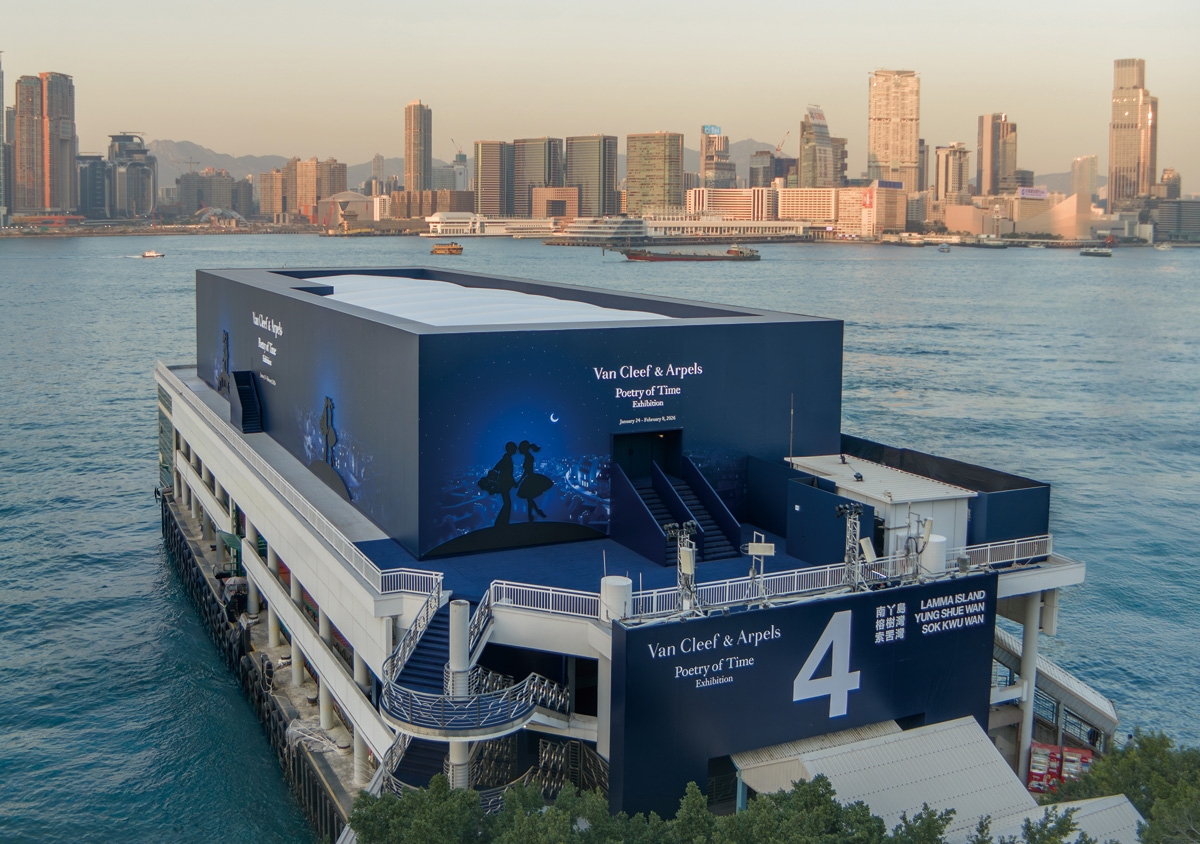전시장은 빅토리아 하버 중심부에 위치한 피어 4 부두 위에 자리했다. 하버 반대편에서도 식별될 정도로 거대한 박스 형태의 전시장 외벽에는 메종의 포에틱 컴플리케이션을 대표하는 밤하늘과 연인의 서사를 담았다. 아시아 무역과 이동의 중심지로 기능해온 홍콩, 그중에서도 이 도시를 상징하는 빅토리아 하버에서 이번 전시를 연 것은 아시아 태평양 시장에서의 포부를 다지는 메종의 전략적 선택으로 해석된다.