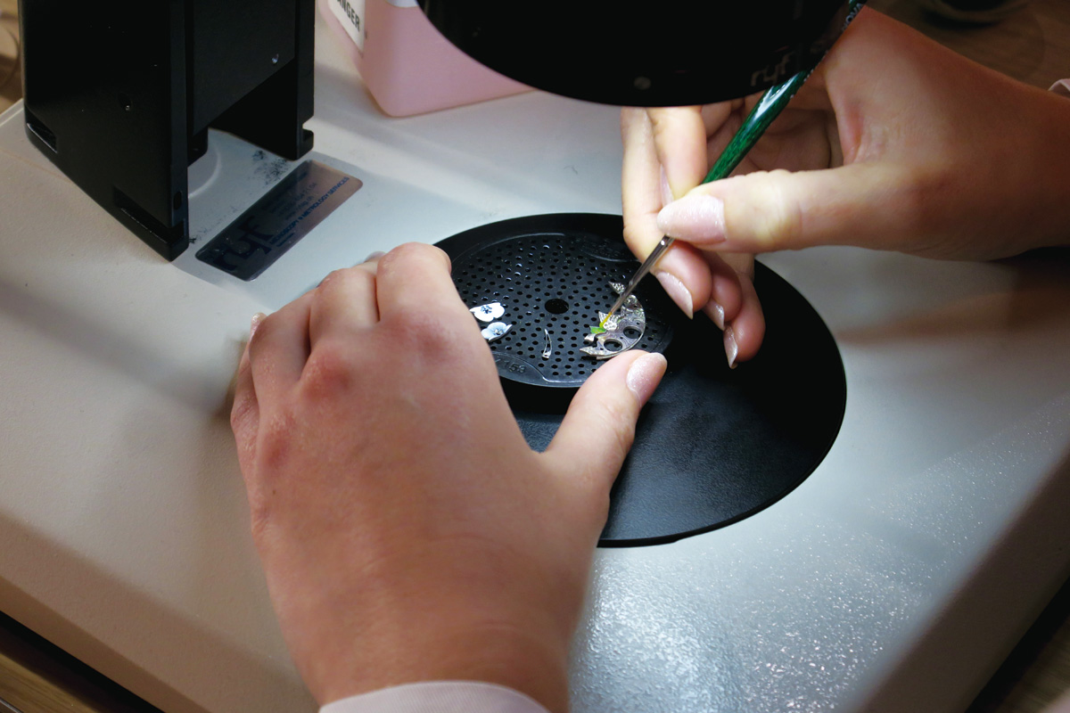 에나멜 장인이 레이디 아펠 브리즈 데떼 워치의 풀잎 부분에 에나멜링을 시연하고 있다.