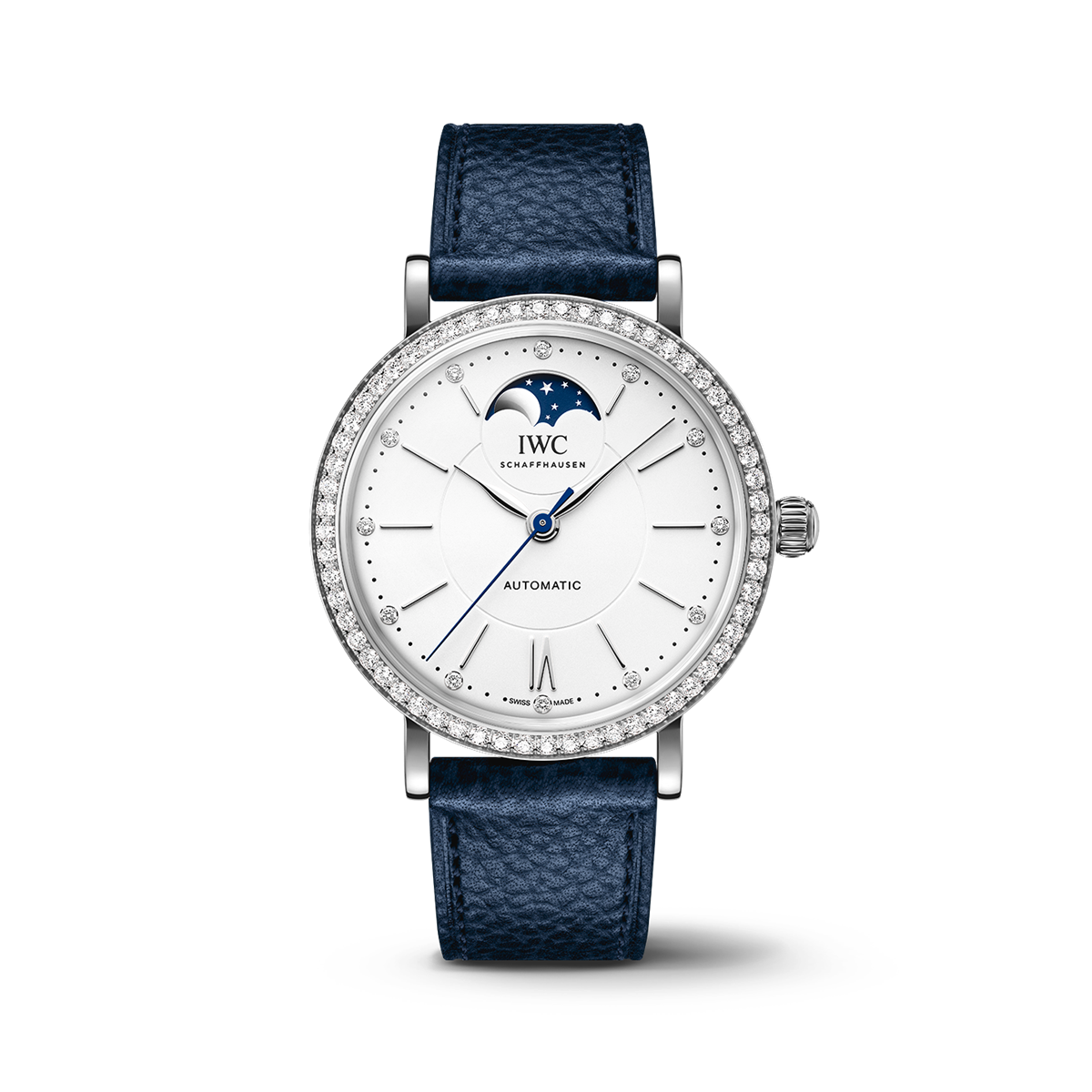 여성들의 사랑을 받아온 포르토피노 오토매틱 37에 문 페이즈 모델이 등장한 순간은 IWC에 있어 중요한 전환점이었다. 우아한 문 페이즈 디스플레이로 포인트를 더하자 공개와 동시에 큰 인기를 끌게된 것이다. 포르토피노 오토매틱 데이 앤 나잇 37과 비슷한 시기에 출시됐지만 시선은 문 페이즈로 쏠렸다. 지금도 포르토피노 오토매틱 문 페이즈 37은 여성 시계 분야에서 지적인 분위기를 자랑하는 독보적 아이콘이다. IW659601는 케이스와 다이얼에 1.12캐럿에 달하는 다이아몬드 72개를 더해 시계에 눈부신 광채를 더했다. 12시 방향에 위치한 짙은 블루 컬러의 문 페이즈 디스플레이는 초침은 물론 블루 카프스킨 스트랩과 비슷한 컬러로 전체적인 통일감을 준다.