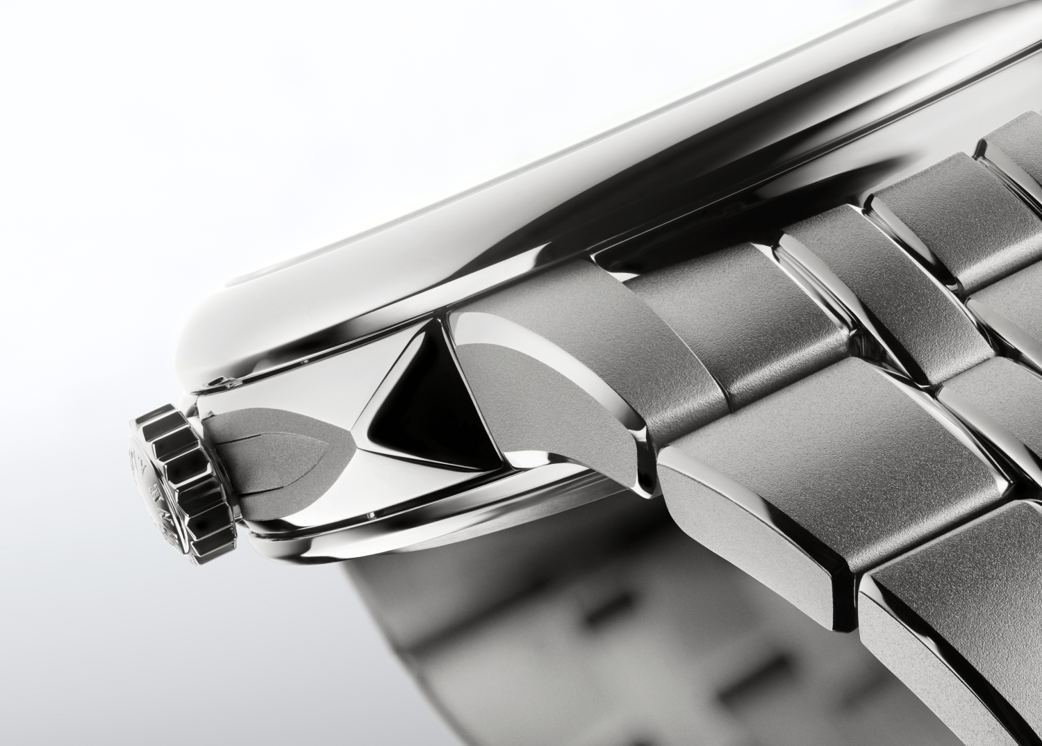 브랜드의 대표 스포츠 워치 오디세우스의 특별한 변주다. 스테인리스스틸을 선두로 화이트골드 그리고 올해 한정판으로 티타늄 케이스와 브레이슬릿을 적용한 모델이 등장했다. 일반적으로 스포츠 워치의 저변을 넓히는 가장 전형적인 수순은 다이얼 컬러를 바꾸거나 크로노그래프, 투르비용 등 컴플리케이션을 점차 확대하는 방향이다. 하지만 랑에 운트 죄네는 케이스 소재로 변화를 주며 브랜드가 자신 있어 하는 소재 가공과 마감에 탁월함을 과시했다. 브랜드 최초로 티타늄 소재를 적용한 이 모델은 탑재한 무브먼트나 기본적인 골격 및 디자인은 기존 오디세우스와 같다. 다만 다이얼에 미세한 곡선 마감이 추가됐고, 아이스블루 컬러 다이얼을 적용했다. 이 컬러 역시 브랜드 내 최초다. 티타늄 케이스와 브레이슬릿을 적용한 모델만큼 무게는 매우 가벼워 손목에 오는 피로가 덜하다. 게다가 브레이슬릿과 클래스프는 실크처럼 곱게 블래스트 처리해 촉감까지 부드럽다. 브레이슬릿으로 넘어가면 브랜드의 자존심과 같은 집념이 느껴진다. 티타늄 소재임에도 불구하고 링크 하나하나 유무광 폴리싱을 조합해 상당한 공을 들인 스포츠 워치임을 알 수 있다.