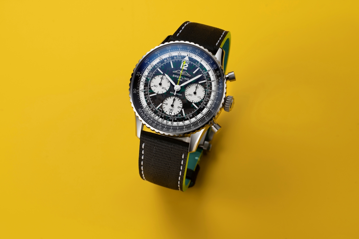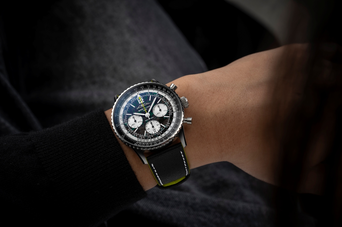 발표와 동시에 첫 협업 시계 내비타이머 B01 크로노그래프 43 애스턴 마틴 아람코 F1 팀도 공개됐다. 브라이틀링의 상징적 파일럿 크로노그래프인 내비타이머를 기반으로, F1 머신의 콕핏에서 영감 받은 소재와 컬러를 더했다. 내비타이머 최초로 티타늄 케이스도 적용됐다. 가벼우면서도 견고한 티타늄 케이스 위에 포지드 카본 다이얼을 조합해 레이스카의 기술적 이미지를 직관적으로 드러낸다. 애스턴 마틴 레이싱 그린과 라임 톤 포인트가 어우러진 다이얼은 팀 리버리를 연상시키며, 스트랩 역시 레이싱 하네스의 질감을 떠올리게 하는 가죽 스트랩으로 완성됐다.