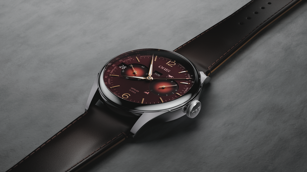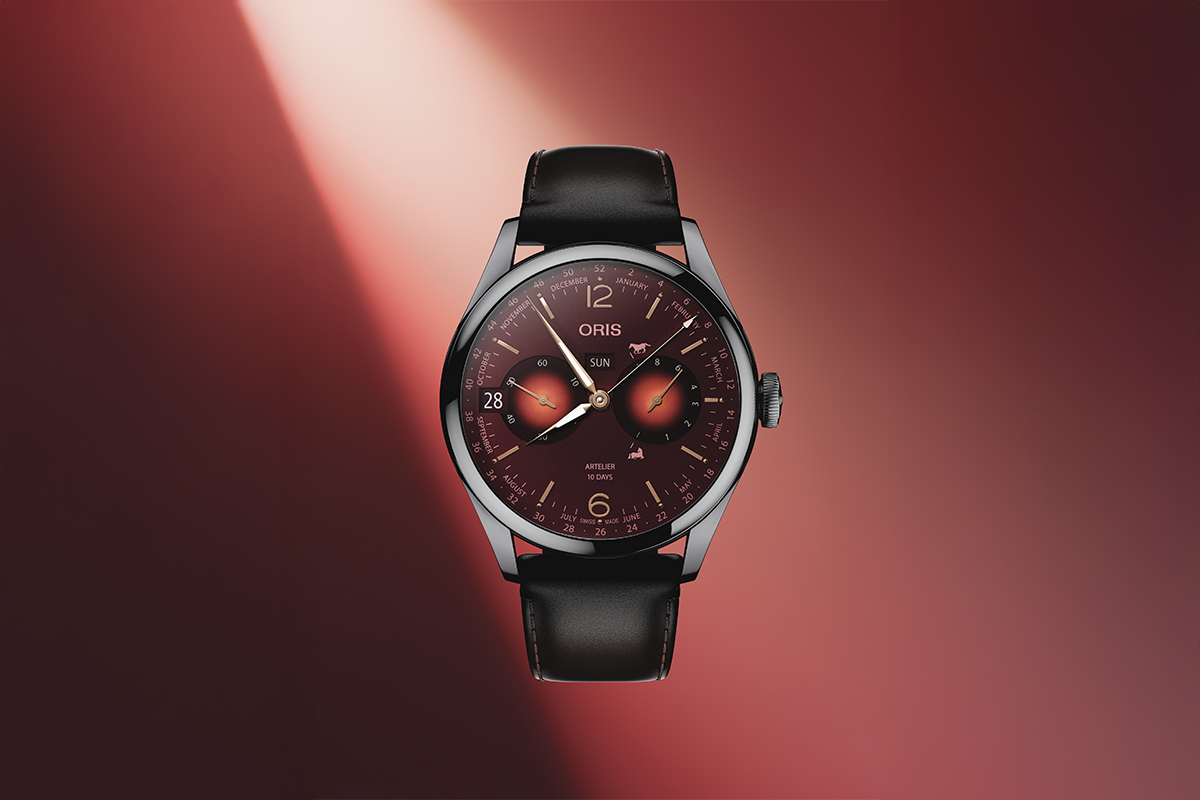 다이얼에서 가장 눈에 띄는 것은 3시 방향의 10일 파워 리저브 인디케이터다. 인디케이터 상단의 10눈금 방향에는 달리는 말, 동력이 없음을 의미하는 하단 0눈금 방향에는 앉아서 휴식을 취하는 말의 형상이 각인돼 있다. 다이얼 컬러는 고급스러운 다크 레드 위로 톤온톤의 핑크 컬러 폰트를 적용했으며, 인덱스와 핸즈는 골드 컬러로 구성해 고급스러운 인상을 완성했다.