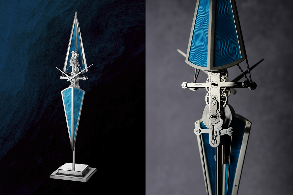 라 레가타 블루 호라이즌은 기요셰 조각에 반투명 에나멜을 결합하는 플린케(Flinqué) 기법으로 완성됐다. 바다가 연상되는 블루 컬러로 마감돼 라 레가타의 보트 콘셉트와 자연스럽게 어울리는 동시에 역동적인 인상을 준다.