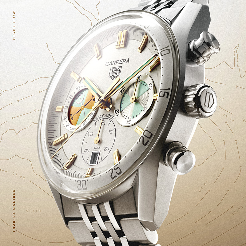 그중에서도 특히 주목할 만한 모델은 밀물과 썰물의 흐름을 알려주는 조수 인디케이터를 탑재한 까레라 크로노그래프 씨페어러다. 2024년 선보인 까레라 크로노그래프 씨페어러 × 호딩키 이후 두 번째 씨페어러 컬렉션이다.